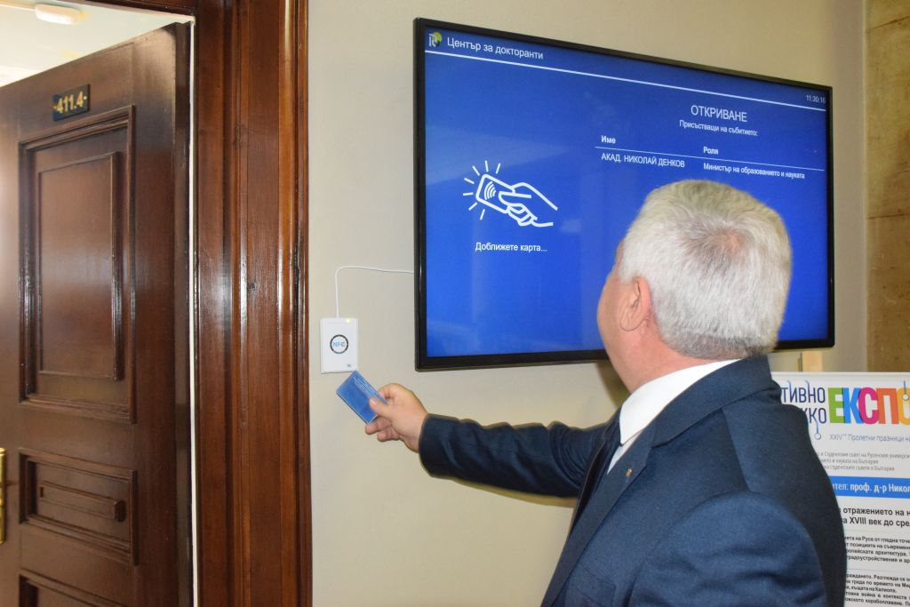 Today the Minister of Education and Science – Acad. Nikolay Denkov, together with the Rector of the University of Ruse - Acad. Hristo Beloev, opened the „EDUCATION FOR FUTURE" Hall. It happened through a smart card with the name and photograph of Minister Denkov. He was acquainted with the dissertation research of the PhD School of the University of Ruse through a Poster Exhibition in front of the Hall.